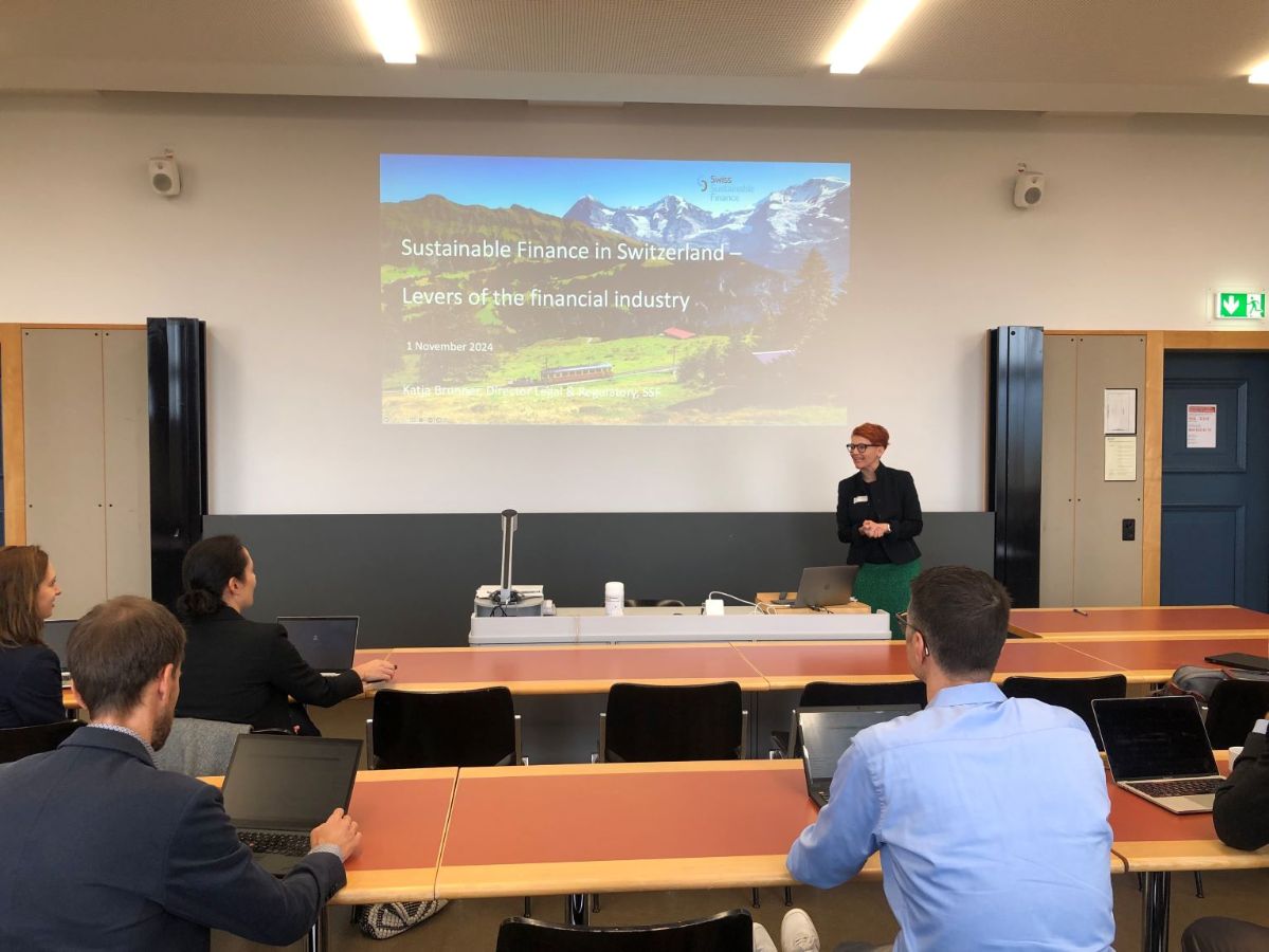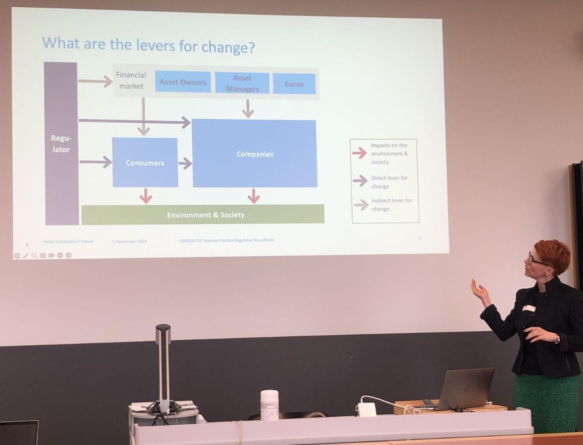 Katja Brunner (Swiss Sustainable Finance) erweiterte die Diskussion in ihrem Vortrag mit der Frage nach den effektivsten Hebeln und den Verantwortlichkeiten der verschiedenen Finanzmarktakteure auf dem Weg hin zu einer nachhaltigen Wirtschaft. Sie betonte dabei, dass der Finanzindustrie als Kapitalgeberin dabei eine wichtige Rolle zukommt, es gleichzeitig aber auch Grenzen gibt, da viele wichtige Entscheidungen in der Realwirtschaft getroffen werden müssen.