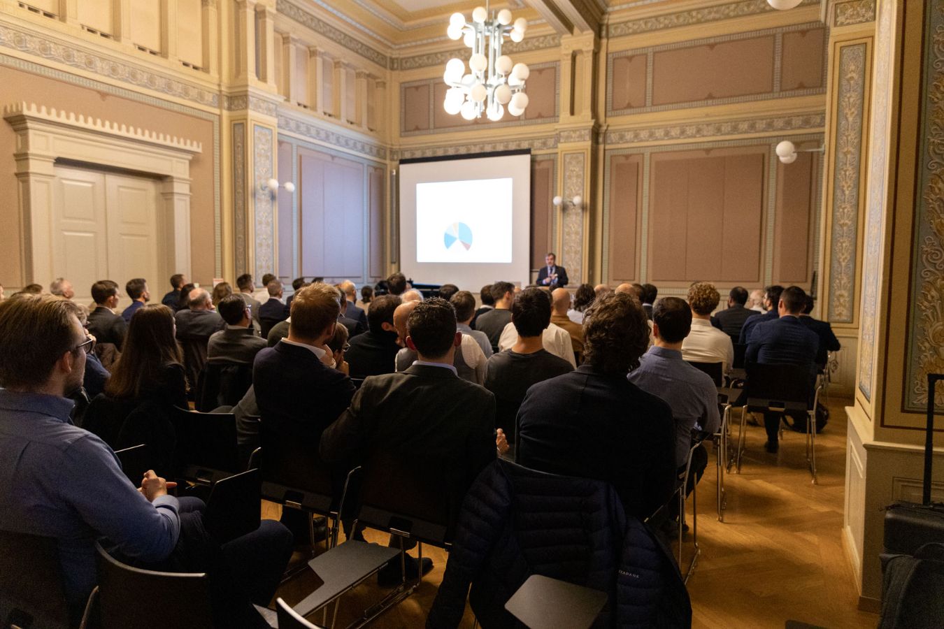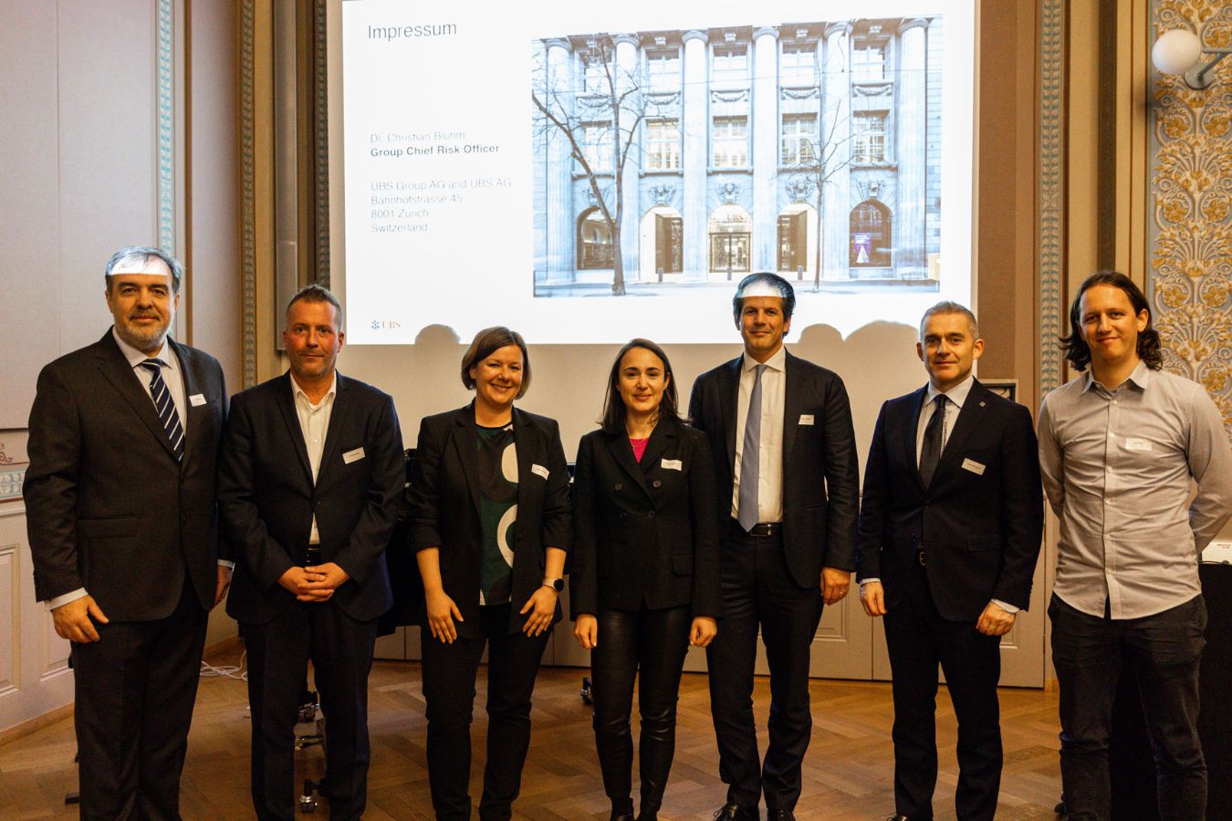 In the first part of the evening Harald Gall (Dean of the Faculty of Business, Economics and Informatics), Josef Teichmann (Head of the Department of Mathematics of ETH Zurich), Freddy Delbaen (one of the founders of the joint Quantitative Finance UZH ETH), several alumni (Kinga Kacmarek, Antonio Del Favero, Isabelle Fries Kuksin, Urban Ulrych), and Christian Bluhm (Group Chief Risk Officer of UBS) shared their views as key note speakers in the small UZH Aula. Martin Weber (Chair of the Board of Directors of Robeco Switzerland) presented the award for the best "Quantitative Finance Master's Thesis", an initiative of the ongoing collaboration beween the University of Zurich, ETH Zurich, and Robeco promoting research on the topic of sustainable investing.